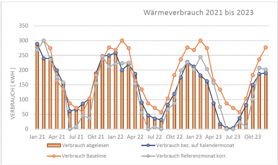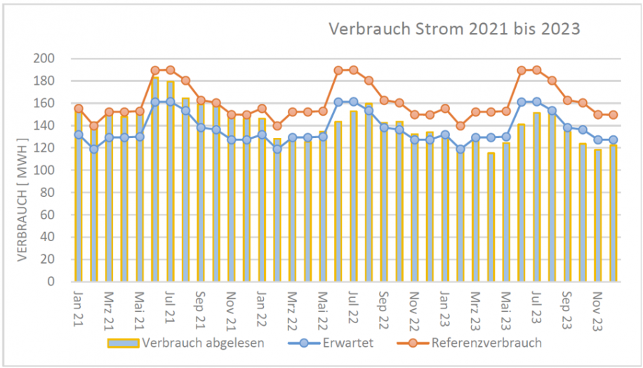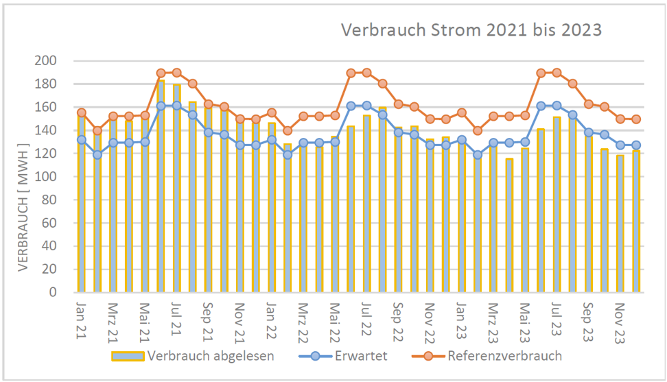 Die umgesetzten Maßnahmen führten zu signifikanten Einsparungen. Für einen umfassend sanierten, energieintensiven Gebäudekomplex (ca. 100 Betten, ca. 17.000 m² Netto Grundfläche, Annahmen für das Fallbeispiel) konnten im Berichtsjahr 2023 folgende Ergebnisse erzielt werden:
